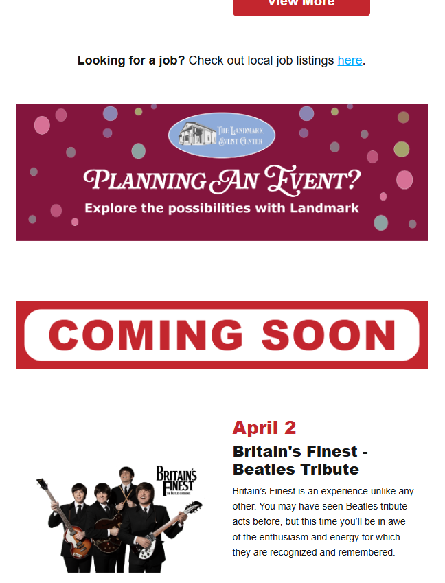 Starting in November of 2025, this e-newsletter has evolved by taking into account analytics based on open rates and clicks. From customizing each newsletter introduction, incorporating individual banner ads for businesses, and creating more categories to organize events in a more intuitive way, this e-newsletter has gone into 2026 stronger.