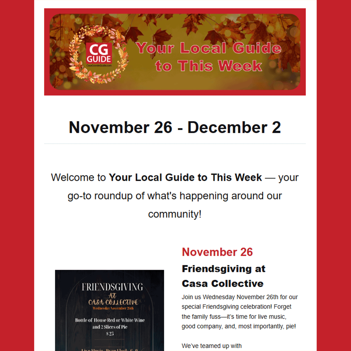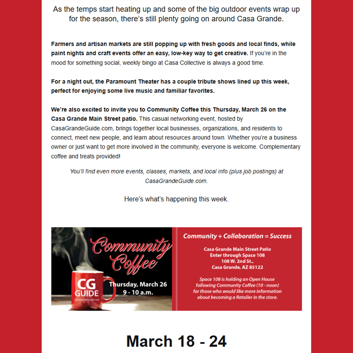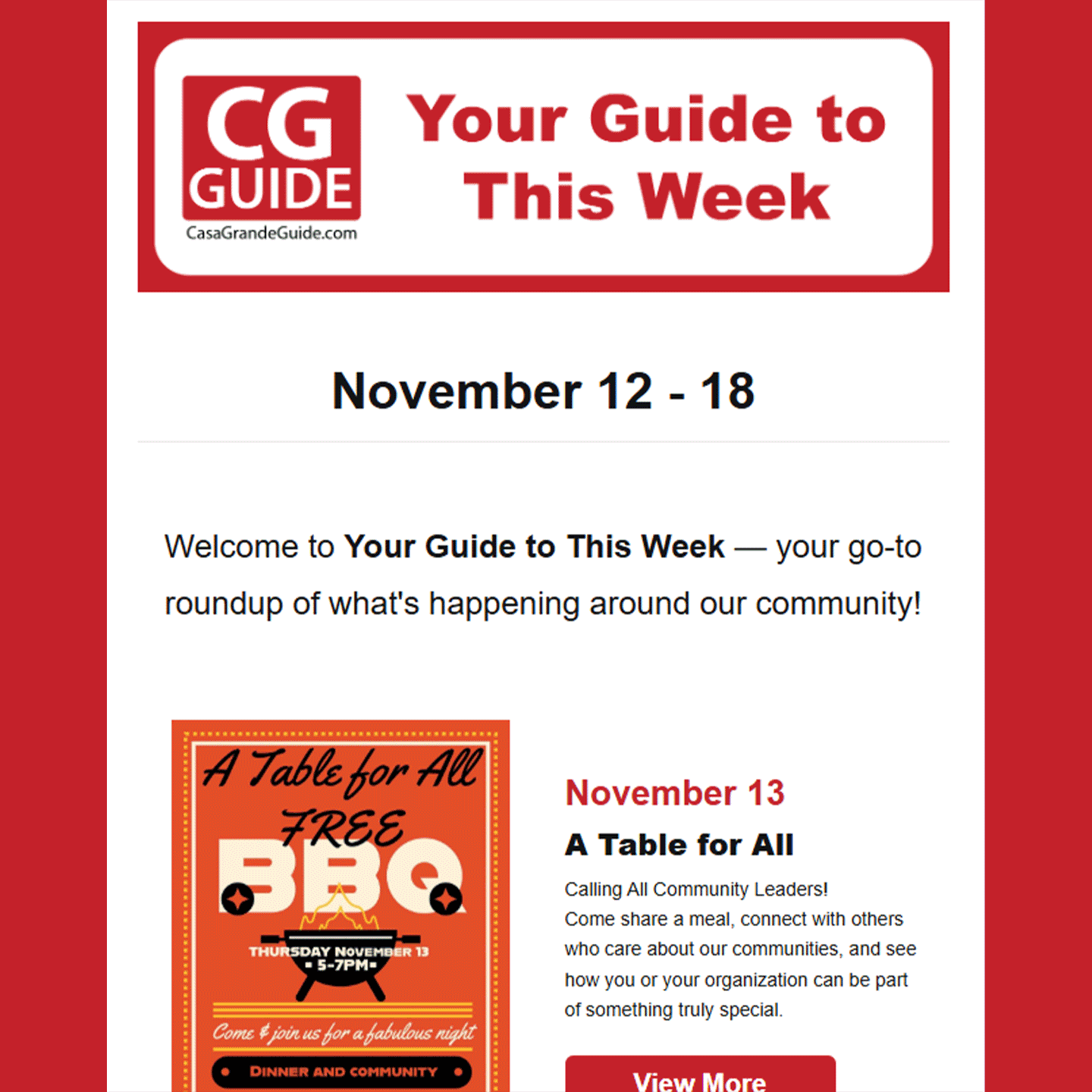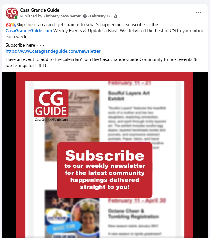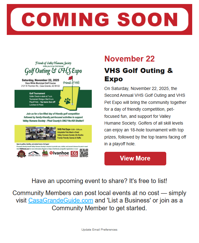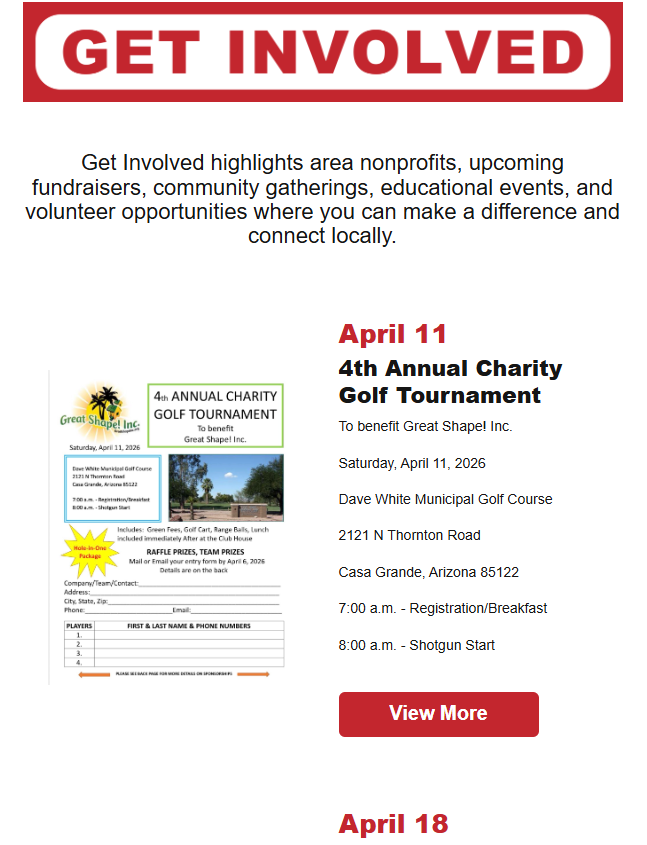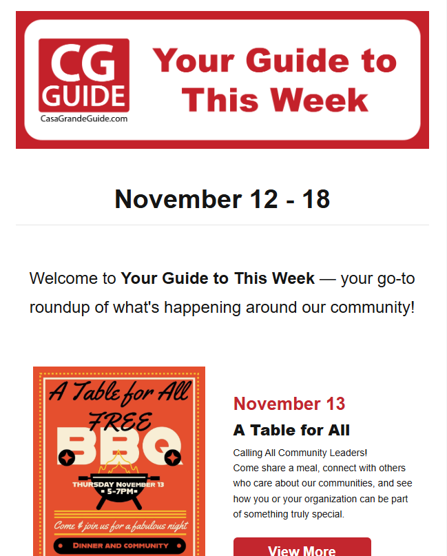 Your Local Guide to This Week is a weekly e-newsletter created to help promote local events in the Pinal County area to the residents of Casa Grande. It also drives traffic back to the main Casa Grande website where visitors can view the entire community event calendar and learn more specific details about each event.